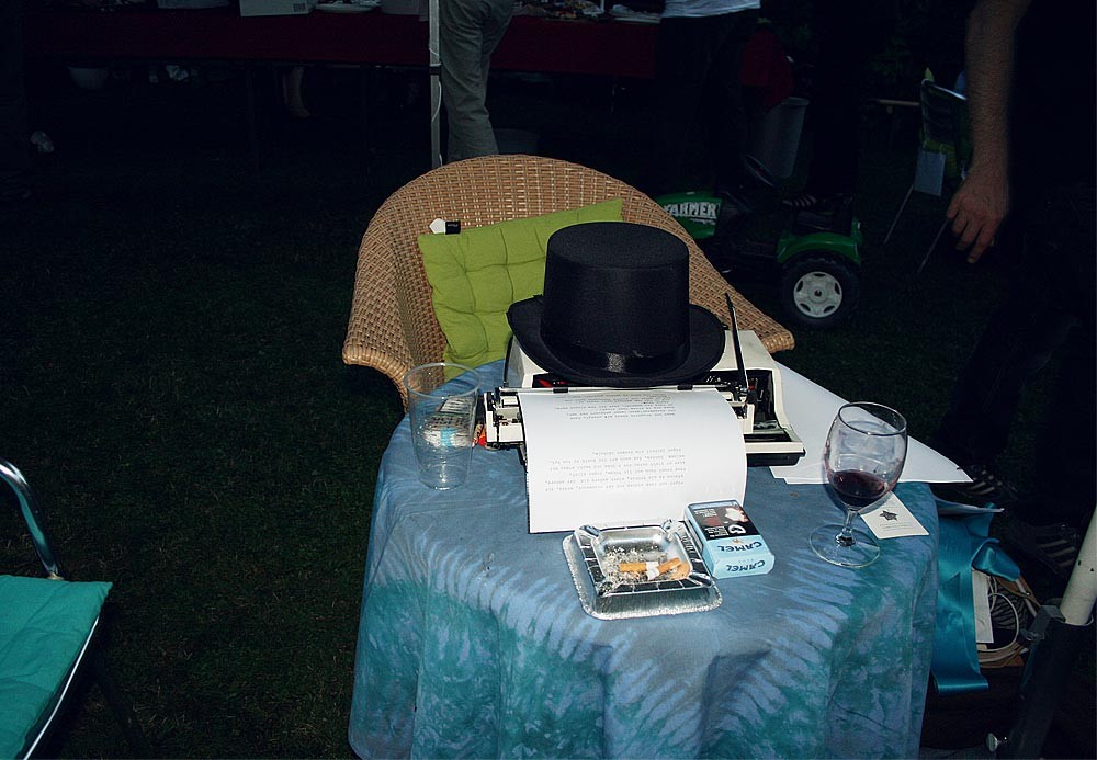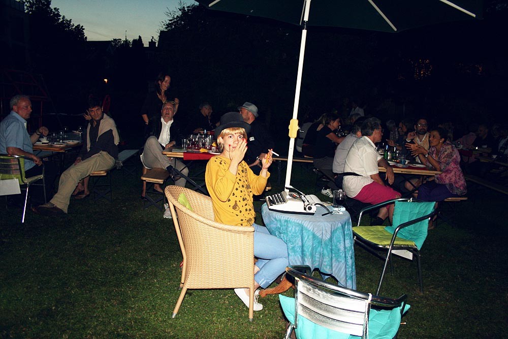Im Garten ist der Holzboden feucht, an den Menschen klebt auch Glitzer. Renes Geburtstag, Zürich, Juli 2014